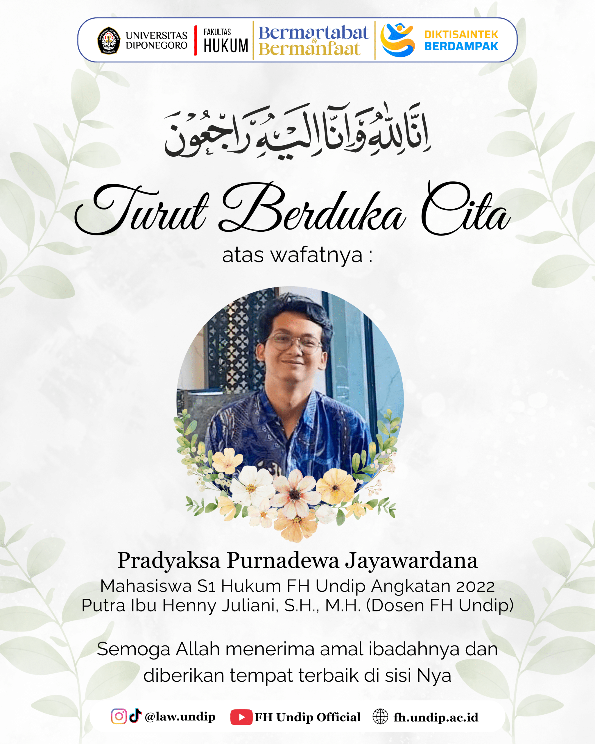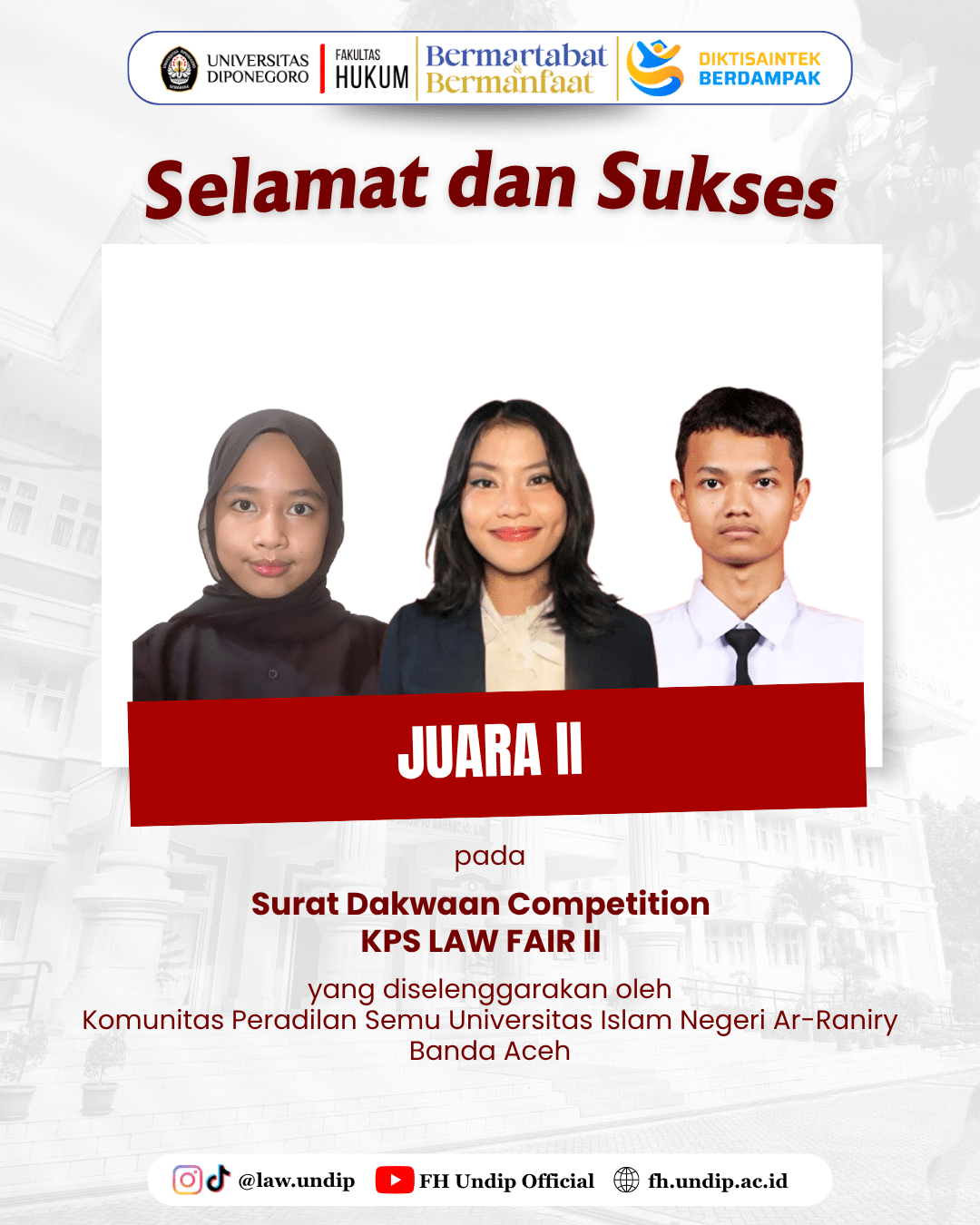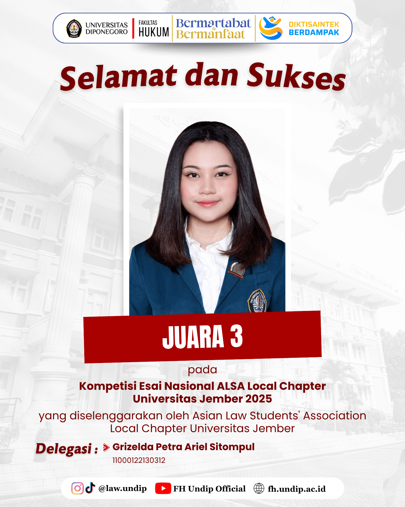 Fakultas Hukum Universitas Diponegoro dengan bangga menyelenggarakan rangkaian kegiatan Adjunct Professor 2025 yang menghadirkan Prof. Dr. Nazura binti Abdul Manap dari Universiti Kebangsaan Malaysia sebagai