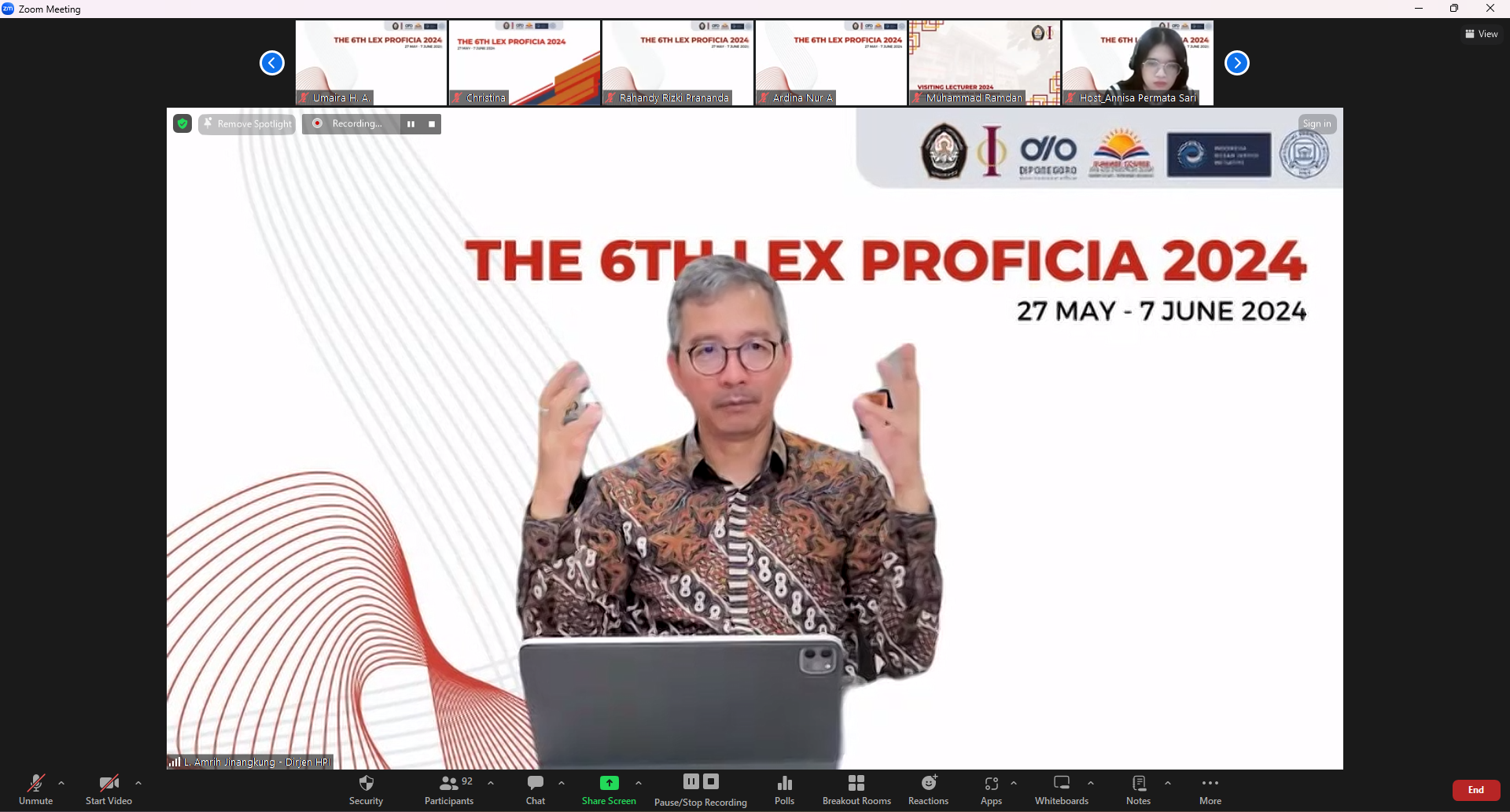 Semarang, May 30, 2024 – The Faculty of Law, Diponegoro University (UNDIP) continued the series of Lex Proficia 2024 summer courses with the sixth session