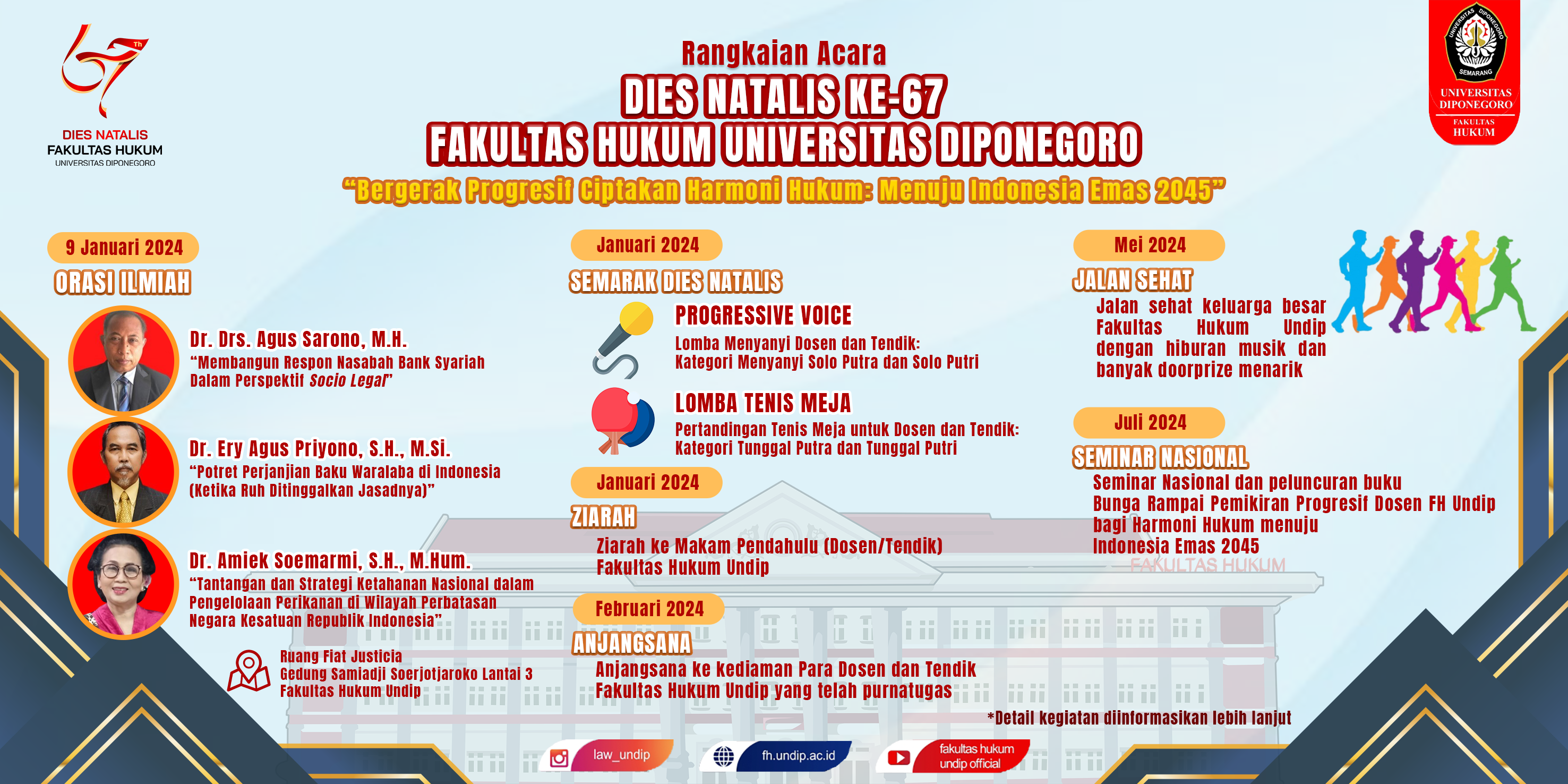 In commemoration of the 67th Anniversary of FH Undip, a Scientific Oration will be held on: day/date : Tuesday, January 9, 2024 at : 08.30
