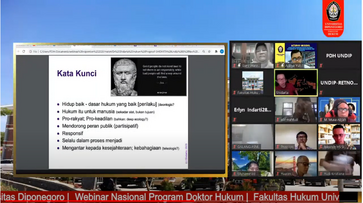 The Doctor of Law Study Program, Faculty of Law, Diponegoro University on Monday, November 9, 2020, held a National Webinar with the theme “Delving into Progressive Legal Thought, Structuring Pathways to Realizing Just Law”. This webinar aims to provide an in-depth understanding of progressive legal thinking for theoretical law bearers and practical law bearers as well as providing a path and courage for practical law bearers to realize just law. The webinar lasts for 3 hours starting from 09.00 to 12.00 WIB via the ZOOM application.