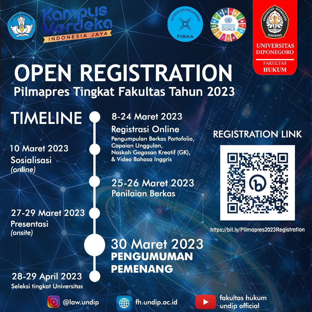 Dengan ini kami dengan bangga mengundang para Mahasiswa Mahasiswi Fakultas Hukum Universitas Diponegoro berprestasi untuk mengikuti program Pemilihan Mahasiswa Berprestasi 2023 (PILMAPRES 2023) dengan timeline sebagai berikut: