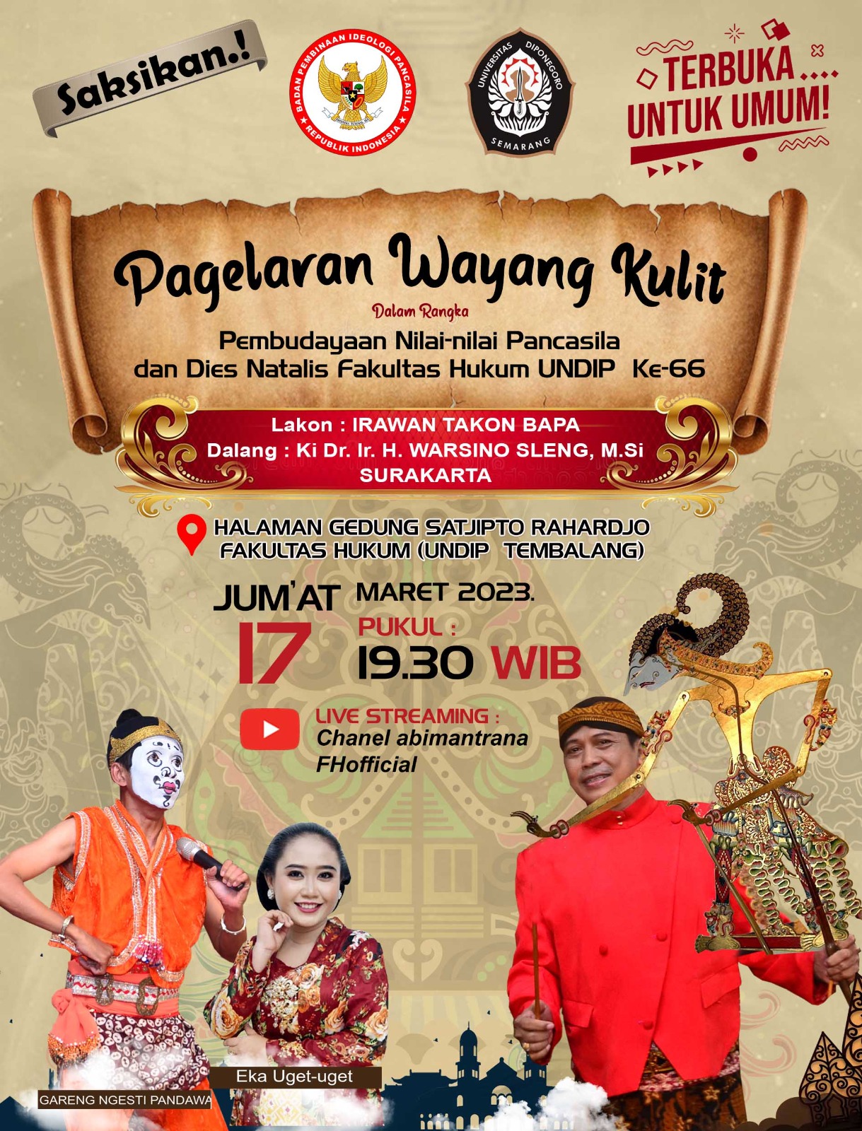 Fakultas Hukum- Dalam rangka membudayakann Nilai-Nilai Pancasila dan memperingati Dies Natalis ke-66, Fakultas Hukum Undip menyelenggarakan Pagelaran Wayang Kulit pada :